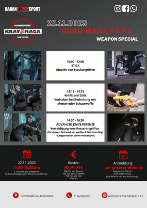 Krav Maga Day 3 - Weapon Special: Verteidigung gegen Stock und Messer sowie Verhalten bei Bedrohungen mit Messer oder Pistole.